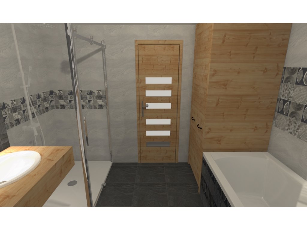 Dlouho jsme se zákazníkem hledali kombinaci vyhovujících šedých obkladů ve větším formátu a myslíme si, že tohle byla ta správná volba. Rozmístění zařizovacích předmětů v koupelně je práce architekta, který nenechal ani místečko nevyužité, tím pádem je v koupelně dostatek úložného prostoru a zároveň tak může v koupelně být dřevěná deska se zapuštěnými umyvadly. My jsme toto umyvadlové zákoutí doplnili o zajímavou světlenou rampičku ve stejném dekoru dřeva.