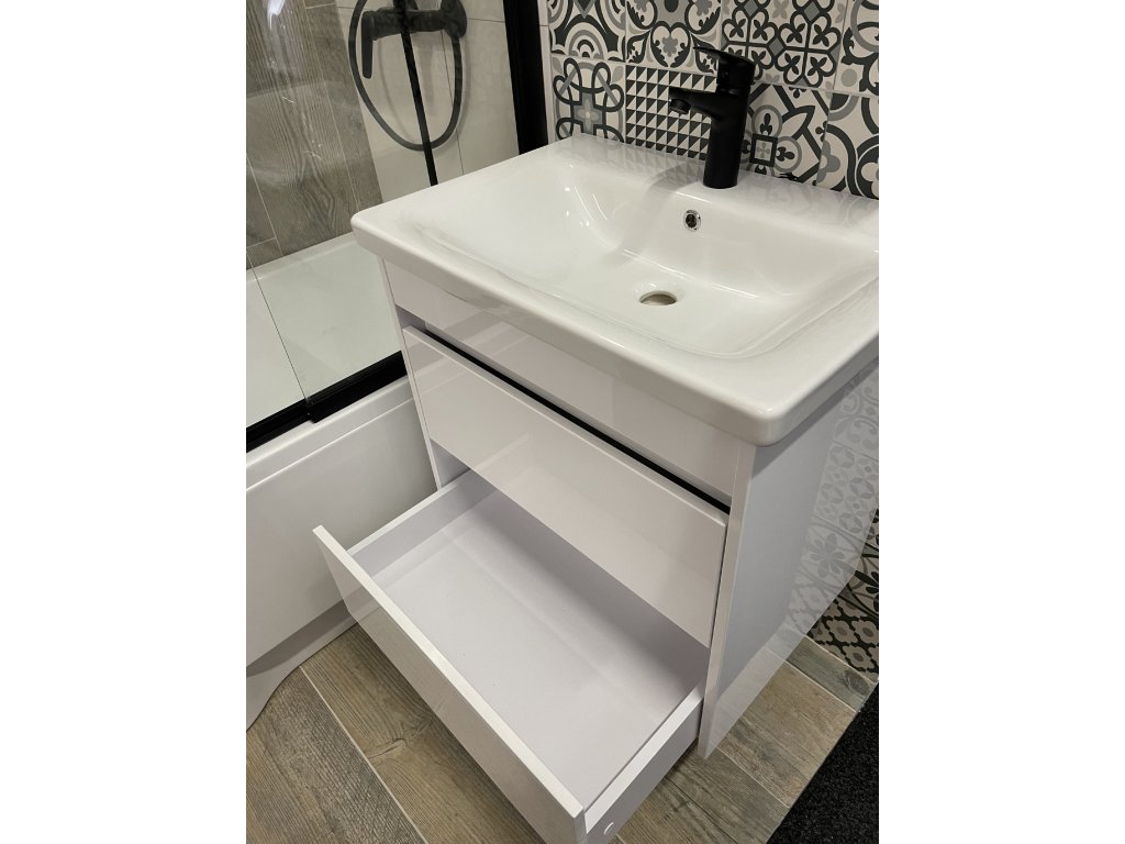 Představujeme Vám zcela nový luxusní koupelnový nábytek, který nadchne úplně každého. Tato naprosto designová skříňka s umyvadlem by rozhodně neměla chybět v žádné moderní koupelně. Skříňka je vyrobena z dřevotřísky o síle 16 mm. Umyvadlo, které je součástí skříňky, je vyrobeno z velice kvalitní sanitární keramiky. Povrchová úprava je řešena bílou lesklou barvou. Velkou výhodou této skříňky je její soft close dovírání, díky kterému bude úžívání skříňky naprosto pohodlné. Pociťte výhody a úložný prostor, který Vám tato skříňka dopřeje.