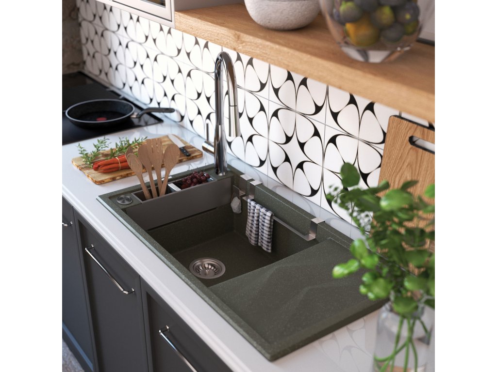 Granitový dřez Magnetic má magnetické vlastnosti, které mu umožňují rychle uspořádat prostor s užitečným příslušenstvím - bez dalšího upevnění. Jedná se o model s jednou objemnou mísou a praktickou odkapávací deskou s motivem rybí kosti, která urychluje odtok vody. Dřez je vybaven magnety, díky nimž lze na bok mísy umístit ocelový kryt. Elegantní rámeček odděluje mísu od boční poličky, kterou lze použít například na sušení příborů.