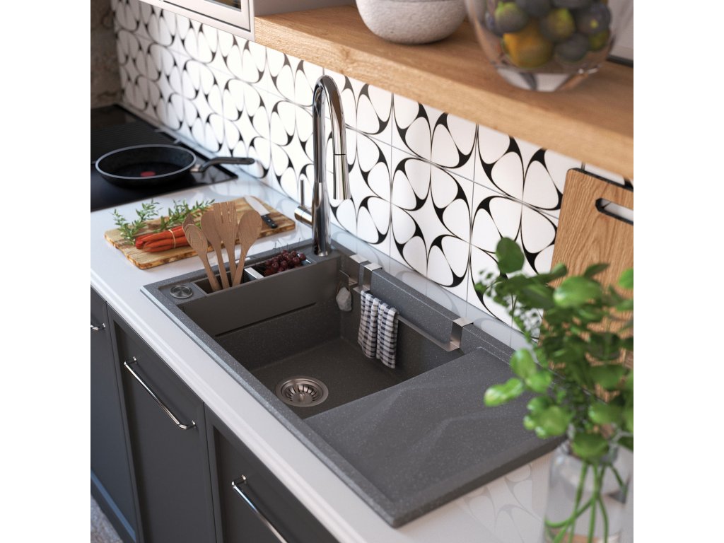 Granitový dřez Magnetic má magnetické vlastnosti, které mu umožňují rychle uspořádat prostor s užitečným příslušenstvím - bez dalšího upevnění. Jedná se o model s jednou objemnou mísou a praktickou odkapávací deskou s motivem rybí kosti, která urychluje odtok vody. Dřez je vybaven magnety, díky nimž lze na bok mísy umístit ocelový kryt. Elegantní rámeček odděluje mísu od boční poličky, kterou lze použít například na sušení příborů.