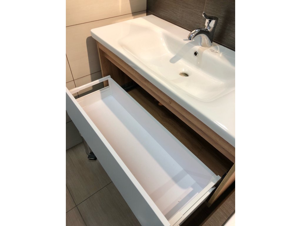 Představujeme Vám luxusní a velice praktický koupelnový nábytek, který nadchne snad úplně každého. Tato naprosto designová skříňka s keramickým umyvadlem by rozhodně neměla chybět v žádné moderní koupelně. Skříňka je vyrobena z dřevotřísky o síle 16 mm. Umyvadlo, které je součástí skříňky, je vyrobeno z vysoce kvalitní a odolné sanitární keramiky. Povrchová úprava je řešena barvou dubu. Skříňka je závěsná, což usnadní úklid Vaší koupelně. Velkou výhodou této skříňky je její soft close dovírání, díky kterému bude užívání skříňky naprosto pohodlné. Pociťte výhody a úložný prostor, který Vám tato skříňka dopřeje.