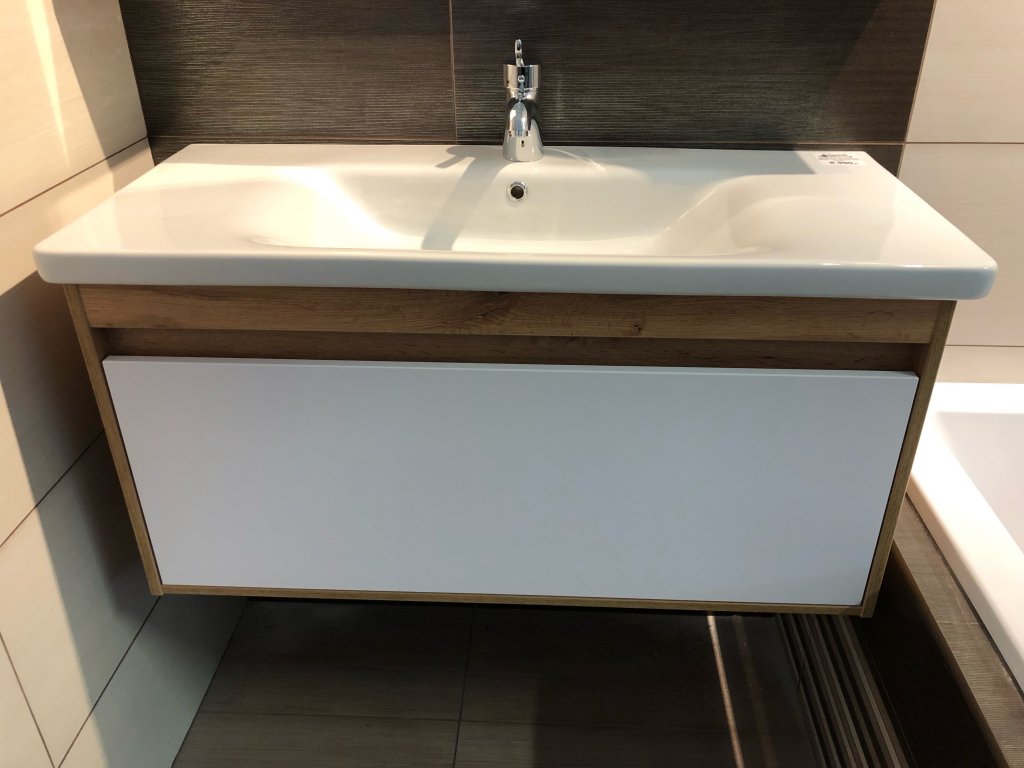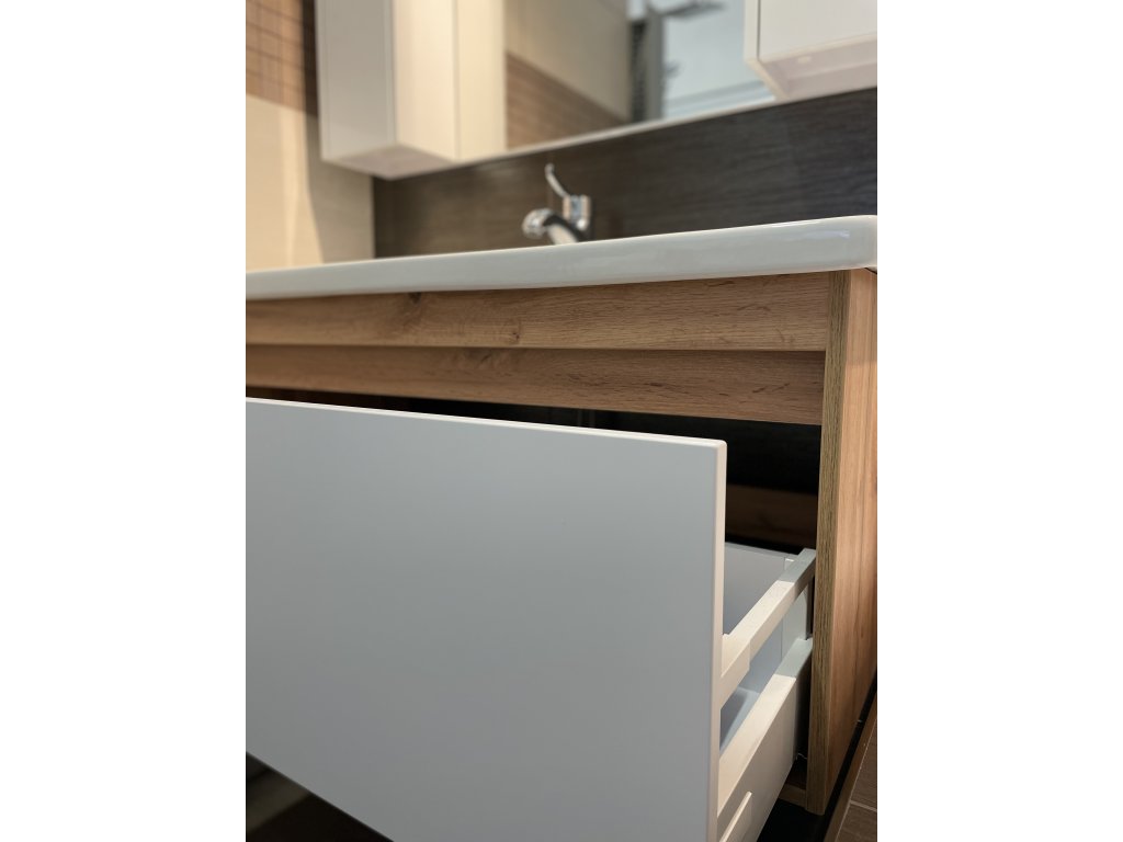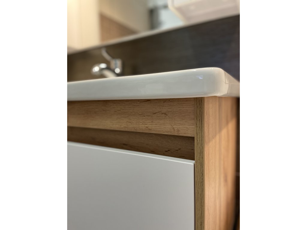 - designová skříňka s umyvadlem v úpravě wotan oak a bílé barvy