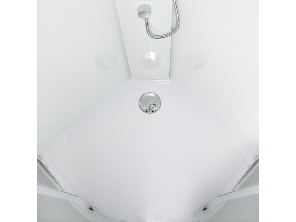 Kompletní masážní sprchový box s chromovými profily a bílými neprůhlednými skly, dešťovou sprchou v otevřeném stropě bez nutnosti připojení k elektrice.