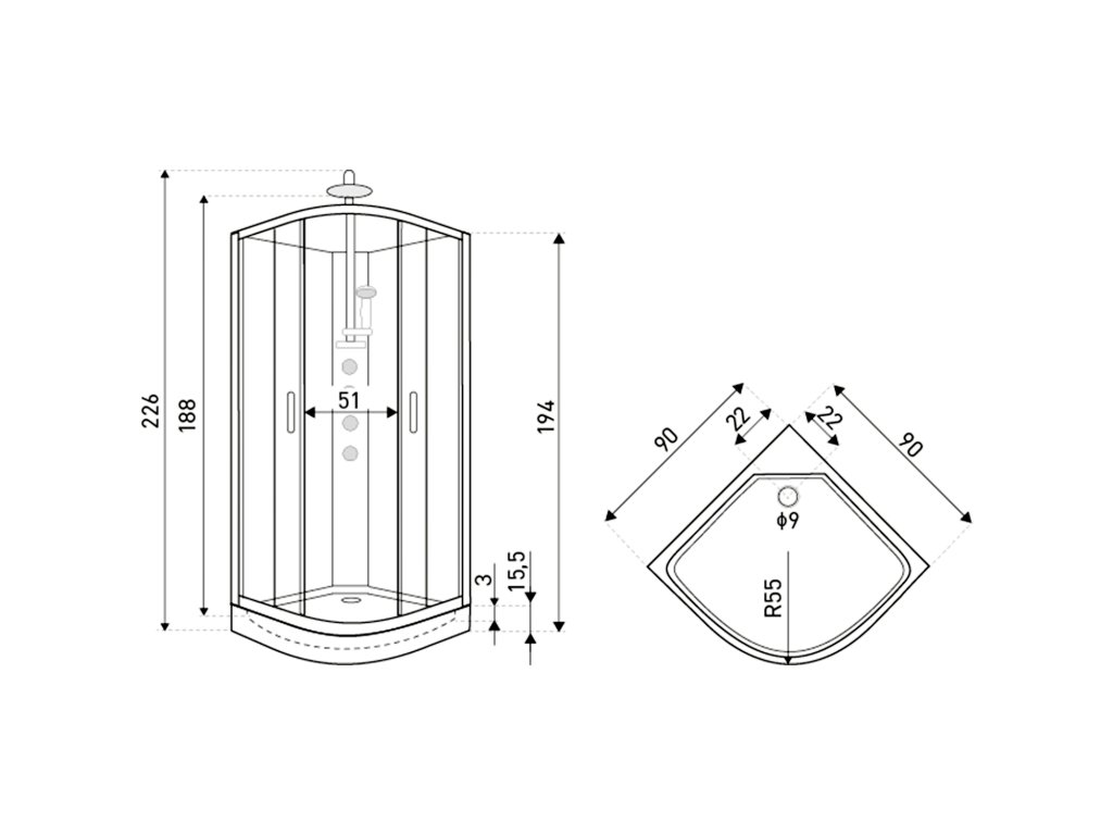 - Rozměry (š×h×v): 90 × 90 × 194/226 cm