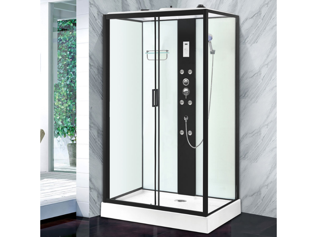 Masážní sprchový box Milano je ideálním řešením do menších koupelen, kde nabídne maximální komfort na minimálním prostoru. Díky nízké akrylátové vaničce s částečně protiskluzovým povrchem zajišťuje pohodlný a bezpečný vstup. Kabina je vybavena 6 hydromasážními tryskami, dešťovou sprchou i ruční sprchou, takže si můžete dopřát relaxaci přesně podle svých představ. Moderní výbava zahrnuje také LED osvětlení, ventilátor, rádio s Bluetooth a ovládací panel pro snadné nastavení všech funkcí. Elegantní kombinace černého hliníkového rámu a bílých skleněných zadních stěn dodává boxu čistý a stylový vzhled.