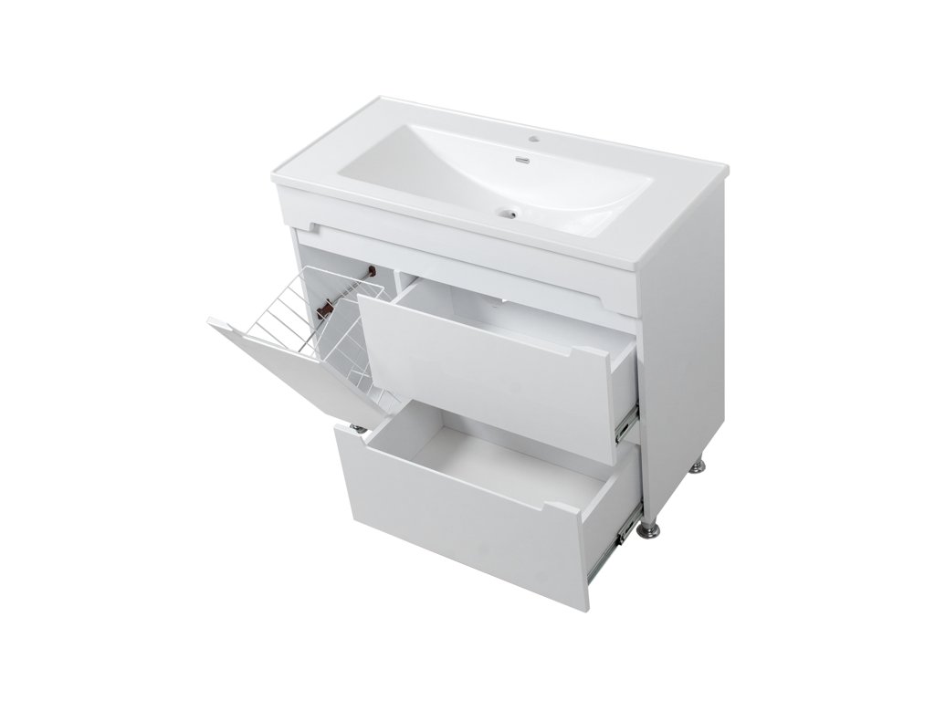 Praktická skrinka s umývadlom a dostatkom úložného priestoru nesmie chýbať v žiadnej premyslenej kúpeľni! Kôš na bielizeň (uteráky) ocení každý, kto má rád v kúpeľni poriadok. Priestranné umývadlo z kvalitného mramoru zabezpečí jednoduché používanie po mnoho rokov. Celkový dizajn skrinky s vysokým bielym leskom pôsobí veľmi moderne a elegantne, je vhodný do každej kúpeľne.