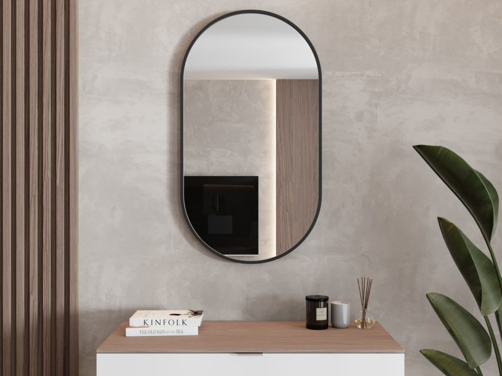 Simple Oval Black je přesně ten typ zrcadla, které umí udělat dojem bez zbytečné show. Černý rám dá prostoru jasnou linku (skvělé k černým bateriím a doplňkům), zatímco ovál ho zároveň zjemní a přidá interiéru lidskost.