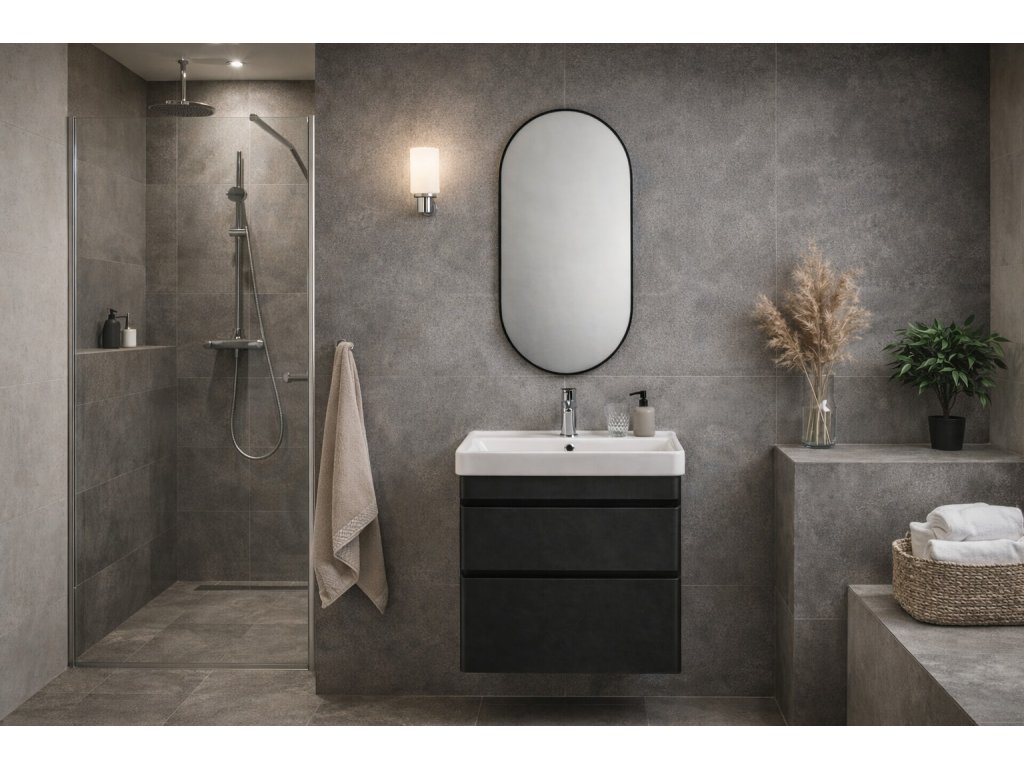 Pokud chcete industriální atmosféru, ale nechcete, aby koupelna působila tvrdě, ovál je chytrá volba. Pomáhá prostoru “dýchat” a často ho i opticky zvětší – hlavně u užších místností.