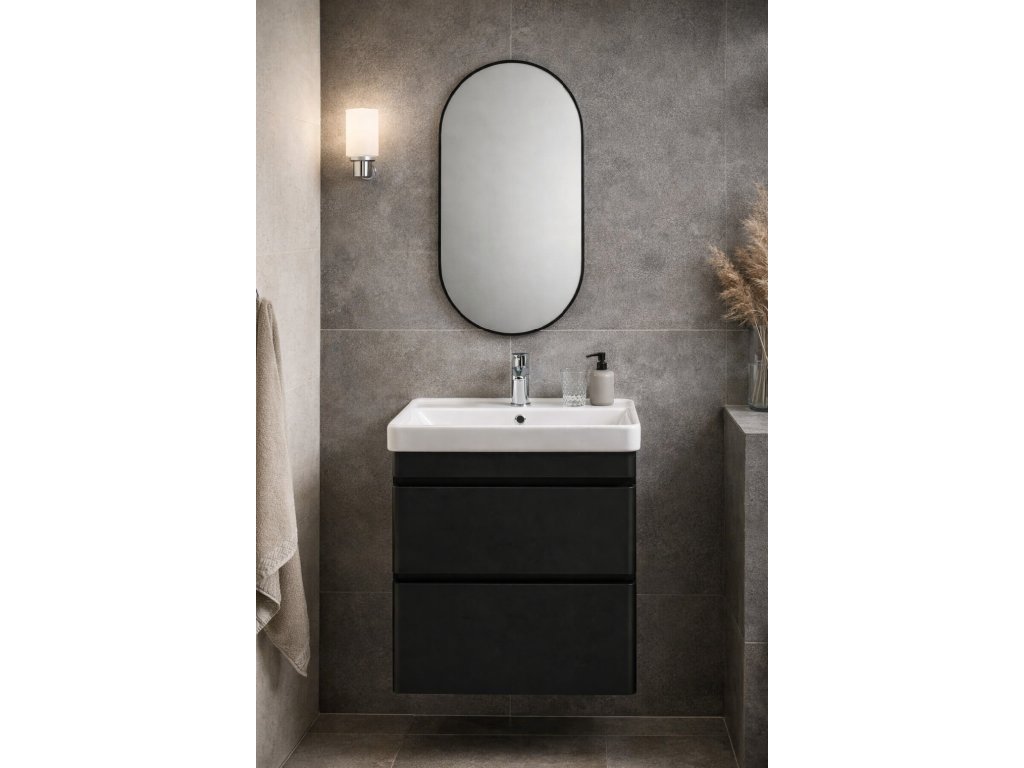 Černý hliníkový rám působí čistě a technicky, ale oválný tvar zrcadla ubírá tvrdost. Výsledek je moderní kontrast, který nepůsobí agresivně.